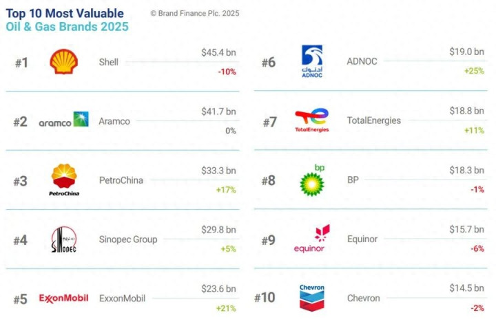 英国品牌评估机构“品牌金融”(Brand Finance)发布“2025全球能源品牌价值100强”榜单(Energy 100 2025)。其中,在“2025全球石油和燃气品牌50强”(Most Valuable Oil & Gas Brands 2025)中名列前十位的品牌是:壳牌、沙特阿美、中石油、中石化、埃克森美孚、ADNOC、道达尔、英国石油、挪威国家石油和雪佛龙。